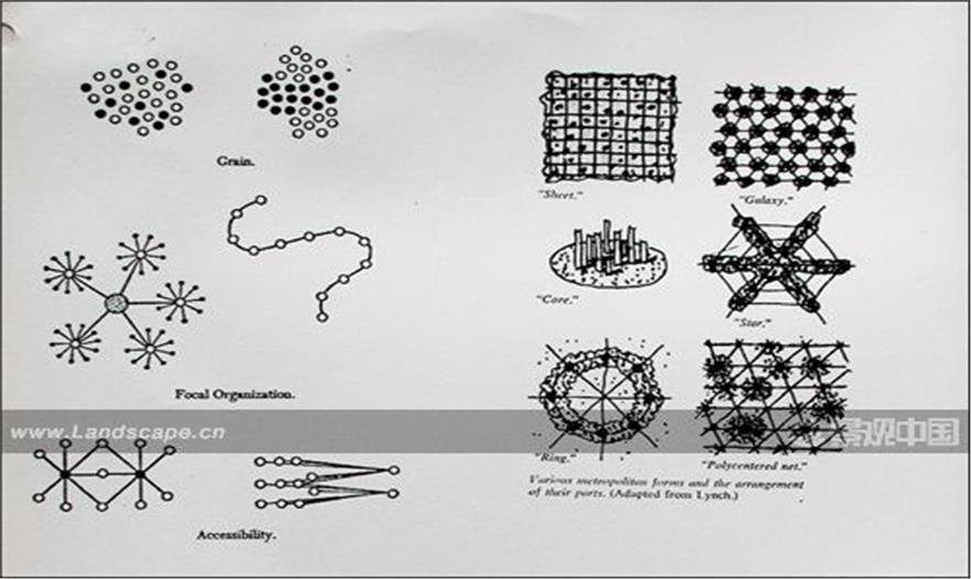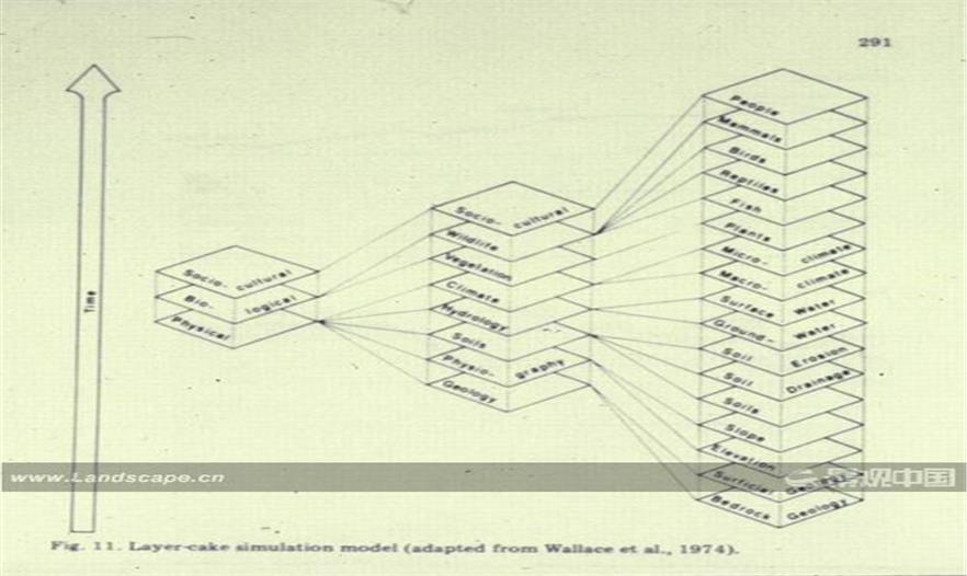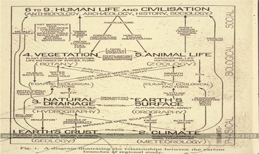 20世紀20~30年代,景觀規(guī)劃的方法發(fā)生了重大變化。這場變革是由英國學者G•E•赫特金斯(G.E. Hutchings)和C•C•法格(C.C.Fagg)所編寫的《區(qū)域勘測導(dǎo)言》(The Regional Survey)一書引起的。1930年他們做了一張圖表,圖22展示,一旦改變景觀軸中的任何一個元素,所有的元素都會隨之改變,景觀系統(tǒng)之間的元素是會互相影響。作為一個景觀規(guī)劃師,我們應(yīng)該擁有非常寬廣的視野來認識我們所在的景觀系統(tǒng),而不僅僅局限在某個方面。在1930年間,區(qū)域景觀規(guī)劃變成了一個職業(yè)。他們的貢獻在于認識到景觀是一個由許多復(fù)雜要素相聯(lián)系而構(gòu)成的系統(tǒng)。
