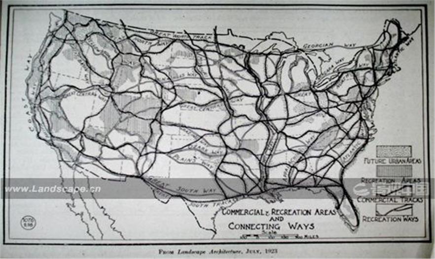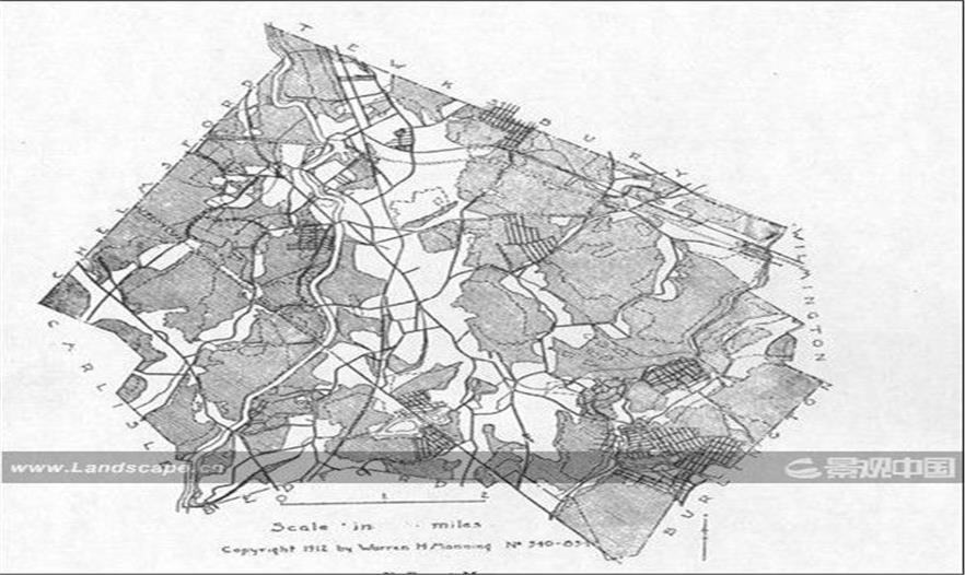 沃倫•H•曼寧(Warren H.Manning)在自己開業(yè)之前,一直以植物專家的身份為F•L•奧姆斯特德工作。大約在1910年,美國開始普及用電,人們發(fā)明了最初只是用來方便描圖的透射板。 1912年,曼寧首次使用它進行地圖疊加,作為一種分析手段,這與我們今天的分析方法非常相似。他當時為波士頓一個郊區(qū)做了一個規(guī)劃。他將一些地圖疊加起來,以獲得新的綜合信息,最后為馬薩諸塞州比勒里卡(Billerica)做了一個開發(fā)與保護規(guī)劃(圖20)。在當時,美國正在繪制可以供大眾使用的國家資源地圖。曼寧收集了400多張關(guān)于土壤、 河流、森林和其他景觀要素的地圖,將其疊在透射板上,基于這樣的方法,他做了第一個全美國的景觀規(guī)劃,并發(fā)表在1923年7月的《景觀設(shè)計》雜志上(圖 21)。這個規(guī)劃與孔堅為中國做的國土安全格局非常相似,但是曼寧還做了未來的規(guī)劃預(yù)景,這或許是中國目前最需要的。這在我們專業(yè)歷史上是最大膽、最具獨創(chuàng)性的規(guī)劃,它向人們展示了哪些地區(qū)應(yīng)該被保護,哪些地方應(yīng)該修建道路,哪些地方適合人們開發(fā)居住。