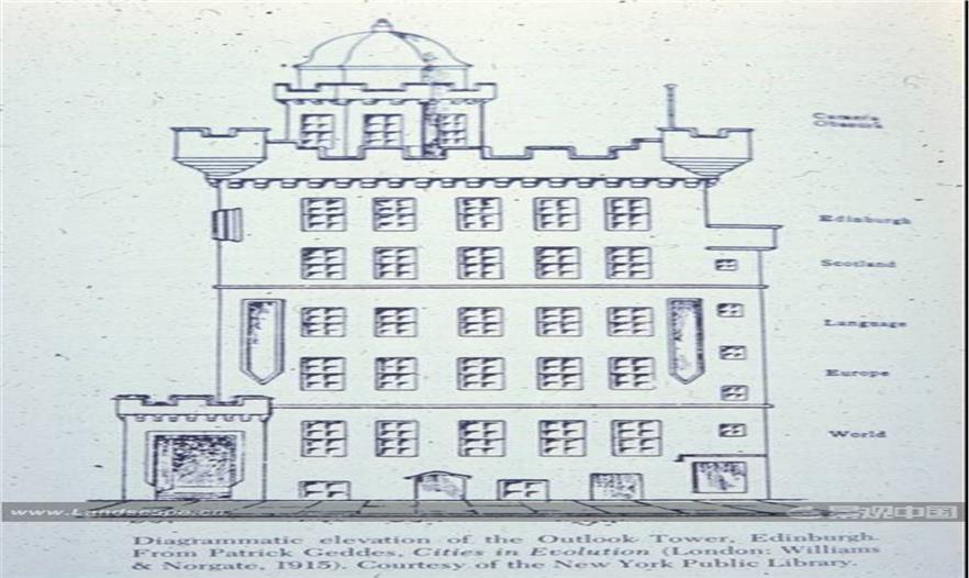 2、人們必須要理解他自己所在的景觀。1892年,蓋迪斯在愛丁堡修建了一座瞭望塔(圖17)。實際上這是一個博物館,一層可以看到世界,接著是歐洲,然后是英國,爬到樓頂上看到的是愛丁堡。人們在游覽這個博物館過程中可以了解到自己所生存的城市地理環(huán)境。蓋迪斯最核心的理念是作為一個設(shè)計師我們必須要了解我們所處的場地,而不僅僅是做一個設(shè)計。