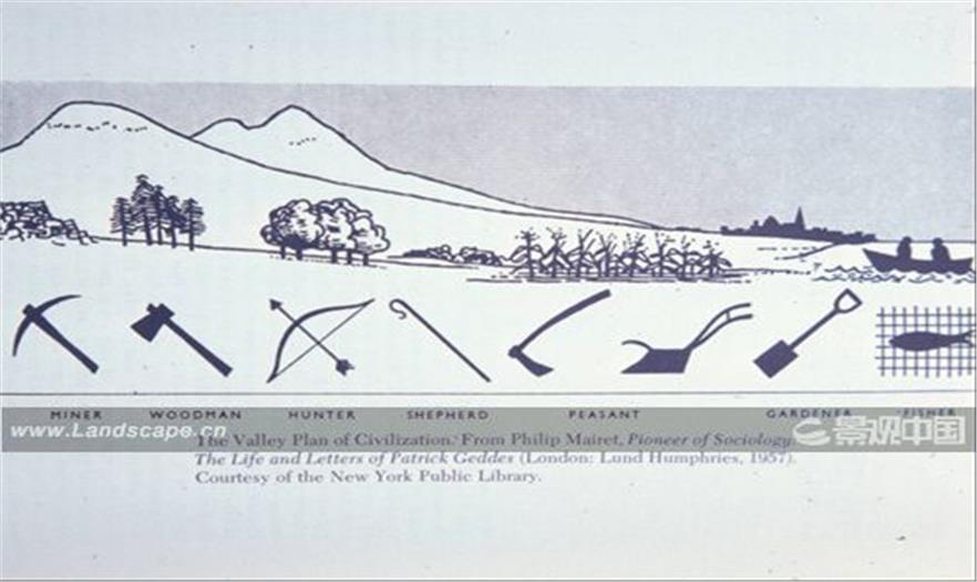 1、山谷剖面(Valley Section,圖16)。作為一個全球思想家和革命家,蓋迪斯非常關(guān)注人類以及他們的活動和他們所處的環(huán)境之間的關(guān)系。山谷剖面展現(xiàn)了人類生活、生產(chǎn)的過程,而且這一現(xiàn)象隨處可見。它通常以山頂為開端,一直延續(xù)到海岸線,事實上在中國,就應(yīng)該是從海邊開發(fā),一直到山上(笑)。在山頂上,通常我們發(fā)現(xiàn)礦工生存的痕跡,接著是森林和伐木工人,然后是牧羊人和獵人,平原地區(qū)是一些農(nóng)民,最后是海邊城市以及一些漁民。“任何有悖于人類自然發(fā)展規(guī)律的設(shè)計都不會成功,甚至會消耗很多能量,這是不可持續(xù)的。”換種說法,大家認為在10層以上的建筑上“可持續(xù)地”種植作物,這真的夠人們享用嗎?