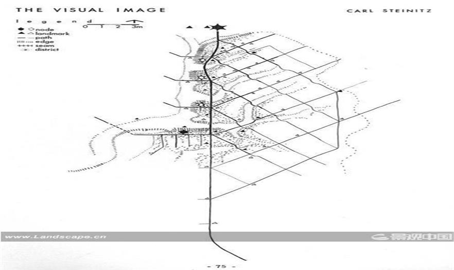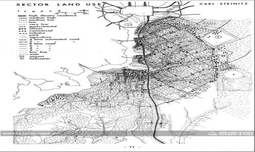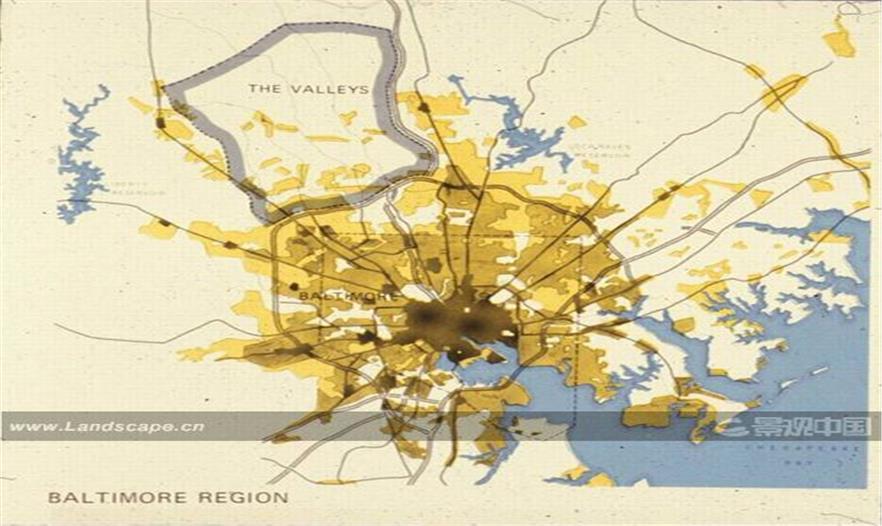 伊恩•L.•麥克哈格(Ian L.McHarg)于1969年發(fā)表了著名的《設(shè)計結(jié)合自然》(Design with Nature),這本書可能是對當今景觀規(guī)劃教育領(lǐng)域最具影響力的書。他提出了一個與他相伴很久、但有些陳舊的設(shè)計方法(圖29)。他最重要的項目是巴爾的摩北面山谷地區(qū)的規(guī)劃(圖30)。麥克哈格和他的同事們認識到有多種開發(fā)模式,他們知道規(guī)劃師應(yīng)該做出不只一個方案,最好可以有多個方案比較,以決定哪個是最佳方案。他們發(fā)現(xiàn)當時最終做決定的并不是建筑師或者設(shè)計師,而是市政規(guī)劃師。還意識到下水道的規(guī)劃會影響著城市的發(fā)展,他們學習了霍華德“花園城市”的理念,依據(jù)坡度進行規(guī)劃。哈格先生最重要的理念,同時也是他在賓夕法尼亞大學執(zhí)教期間最重要的理念是設(shè)計師、工程師和科學家應(yīng)當在一起合作, 以創(chuàng)造更為優(yōu)化的景觀。