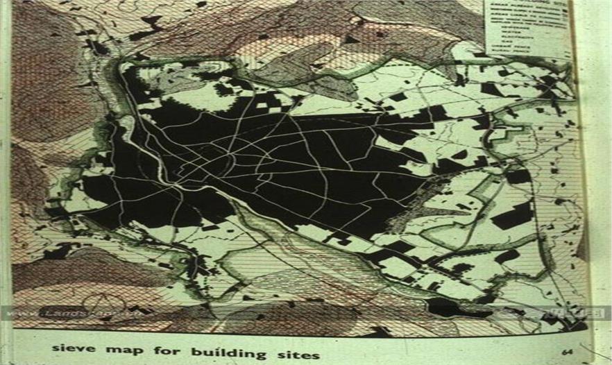 同時在那個年代,區(qū)域景觀規(guī)劃變成了一種職業(yè)。L•B•埃斯克里特(L.B.Escritt)所寫的《區(qū)域規(guī)劃》(Regional Planning)一書于1943年出版,這本書不過1cm厚。如果我的那些剛?cè)腴T的學生們閱讀完此書,他們將會學會我教新生的許多東西。例如他們將會學到如何疊加圖層,如何利用它有針對性地分析景觀等(圖23)。這些技術(shù)手段是非常簡單有效的。1947年,英國選舉產(chǎn)生了左翼領(lǐng)導(dǎo)的政府,開始對全國土地進行國有化管理。因為擁有用來培養(yǎng)規(guī)劃師的教材,英國可以迅速建立一套良好的規(guī)劃系統(tǒng)。圖是英國艾克斯特城,可以發(fā)現(xiàn)來自各種方向的線條,每一個線條都是不同元素的安全格局,深色區(qū)域是不適合建設(shè)的區(qū)域,淺色的是適合開發(fā)的區(qū)域。我們在做規(guī)劃的時候可以根據(jù)它的適應(yīng)建設(shè)性來做規(guī)劃,非常有效。