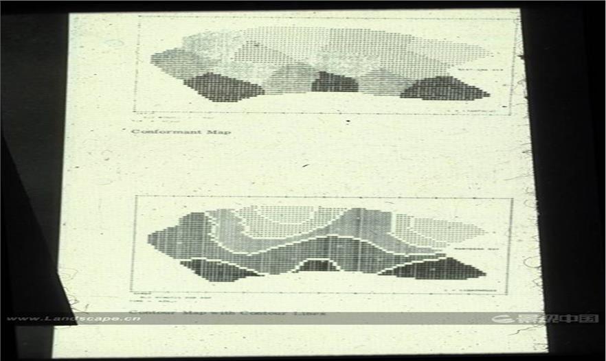 霍華德•菲舍爾(Howard Fisher)是一位建筑師,他發(fā)明了第一個具有實用價值的計算機圖形軟件SYMAP(圖31)。1963年他來到哈佛大學,我成為當時世界上最先使用計算機繪圖的人。當時我試圖用計算機來做一些關(guān)于波士頓城市意向的研究。圖32是我50年前的照片,現(xiàn)在最大的差別就是頭發(fā)變成了胡子。1965年,我和4個研究生一起使用計算機進行區(qū)域規(guī)劃,我們用GIS完成了這張難看的地圖(圖33),但是用的理念和今天非常相似。1967年,已經(jīng)產(chǎn)生應(yīng)用計算機繪制透視圖(圖34)和表現(xiàn)圖的技術(shù),這是45年前的事情。