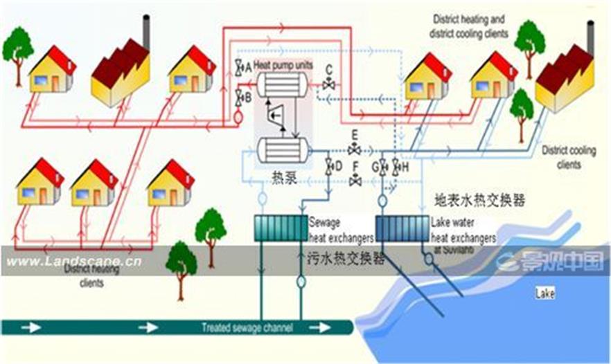 最后說的是人員,水在循環(huán)、交換的過程中,具有能源上的潛力。水體自身本來的季節(jié)晝夜的溫度變化小于空氣,比傳統(tǒng)意義上的空調(diào)具有更大的能源上的機會,經(jīng)過能源的轉(zhuǎn)換,同時接入到中央的供熱制冷系統(tǒng),提供整個小區(qū)的供熱制冷,節(jié)省了各個建筑自身通過中央體系、各家通過空調(diào)帶來的能源消耗。同時在主動的能源的控制上,還有被動的保持,通過綠化,屋頂綠化,庭院綠化,減少熱的效應(yīng),一起最終形成了中水系統(tǒng)的保持、水量、水質(zhì)、城市景觀上的優(yōu)化,能源系統(tǒng)上的節(jié)能,綜合性的考慮了社區(qū)的低碳系統(tǒng)。