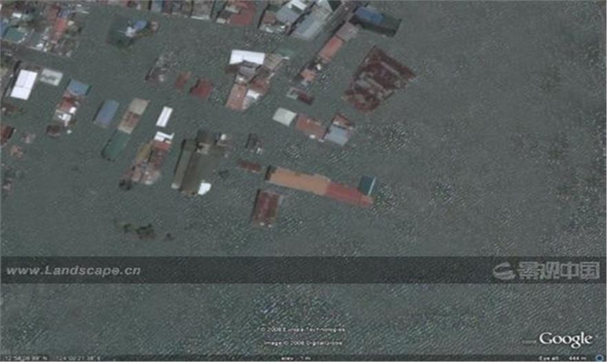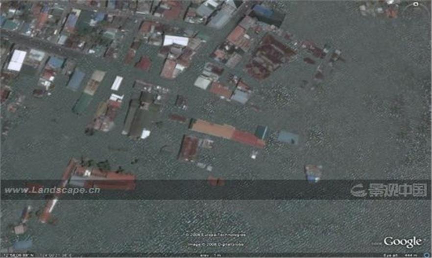 這是我昨天得到我的同時發(fā)給我的一個圖片,是兩天前發(fā)生在泰國的洪災情況。圖6中可以看到樹上的這個印記,大概有五英尺(1.5m)高,它是上一次洪水的印記。人們也許很難想象,盡管每年都會發(fā)生這樣的洪水,但這里的人們還是生活得很好。這個印記會越來越高,河道旁邊的一些民居的基地比水面要高出7~8英尺(2.13~2.43m)。這就是水域景觀的元素。