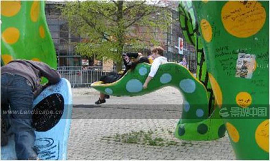 這是在法國里爾火車站上廣場的一個雕塑(圖1),是日本藝術(shù)家的設(shè)計。在這個雕塑里邊,大家看到有一個人坐在這兒,從另一個角度看,還有一對情人就躺在葉子里邊,大家看一看,這是多么生動的作品,對這件作品來說,你認為設(shè)計重點是他設(shè)計了一個巨大的雕塑,還是這兩個情人才是真正的作品呢?是他們的存在,才使這件作品更具有魅力,更具有動感,這件作品才不會死掉,藝術(shù)的生命,景觀的生命,就在于這種參與。