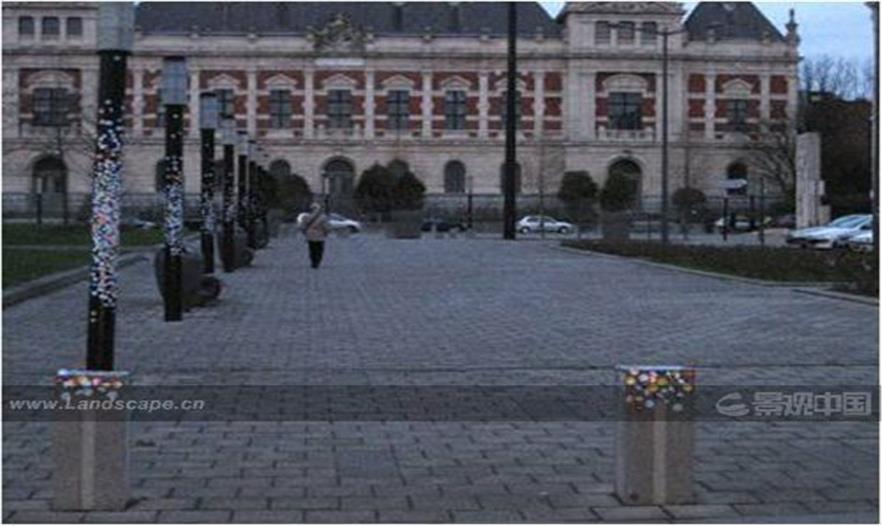 這一幅圖片就很奇怪,其實沒有設(shè)計。這是一個博物館入口處的廣場(圖2),這個廣場上的路燈有很多漂亮的小彩色點,這些彩色點其實是門票。從周一到周日,每天門票都要換一個顏色。你買了票進了美術(shù)館以后,會給你沾上一個小圓貼,出來以后,不知道是誰第一個開始把這個小圓貼貼在路燈柱上,從此以后,就會有人這樣陸陸續(xù)續(xù)地貼出來。有一次我來到這個廣場坐在旁邊上,我認認真真地觀察,發(fā)現(xiàn)有一個走出博物館的人拿著他的小貼,非常認真的在比量。這個地方已經(jīng)有一個紅色了,他這個貼也是紅色,因為是同個顏色所以他換另一個地方。他貼的那么認真,那么感人,這是一個集體創(chuàng)作,如果有一天景觀能夠讓使用者參與進來,才能夠真正實現(xiàn)景觀的社會性,才能使景觀融入到我們的生活當中。