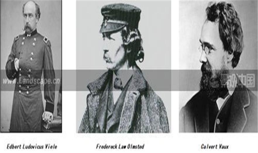 在創(chuàng)造的初期,Edbert Ludovicus Viele(圖3左1)是創(chuàng)造中央公園一個(gè)極其重要的人物,他其實(shí)是中央公園的第一個(gè)設(shè)計(jì)師,他在1856年的時(shí)候,做了中央公園的測(cè)繪。從中央公園的測(cè)繪圖,你可以清晰地看到當(dāng)時(shí)的土地的地貌,當(dāng)時(shí)的建筑的位置,當(dāng)時(shí)的水系。他1856年提交方案給當(dāng)時(shí)的委員會(huì),被委員會(huì)認(rèn)定為初期的規(guī)劃設(shè)計(jì)。在這個(gè)初期的規(guī)劃里邊,包括公園的功能定位,它的功能組織,有六條貫穿公園的主干道,方案中還要求設(shè)計(jì)大型飲水水源,體育功能設(shè)施,兒童活動(dòng)場(chǎng)地,包括能夠提供公共服務(wù)的各種設(shè)施,所有的設(shè)施能夠滿足游行或者集會(huì)等群體活動(dòng)的需要。所有需要考慮的,包括需要保護(hù)的高地等,一切在這個(gè)方案里都得到了反應(yīng)。Edbert有兩點(diǎn)值得一提:一,他的審美被別人攻擊,很多人認(rèn)為他的設(shè)計(jì)缺乏一些經(jīng)典的審美因素;第二點(diǎn),他是一個(gè)西點(diǎn)軍校畢業(yè)的軍官,是一個(gè)工程師,是一個(gè)跨界的設(shè)計(jì)師,但是一個(gè)非常難以合作的人。而之后代替他設(shè)計(jì)中央公園的Fredereck Law Olmsted形容自己是一個(gè)共和黨和民主黨都能接受,都能合作的人。中央公園也最終成就了Olmsted,Edbert卻被世人遺忘。所以我們的設(shè)計(jì),我們的教學(xué),除了教授知識(shí)之外,使我們的同學(xué)能夠在學(xué)習(xí)的過(guò)程中同時(shí)擁有比較高的情商,也是非常重要的。不能變成這個(gè)項(xiàng)目成功了而設(shè)計(jì)師自己被大家淡忘了。
