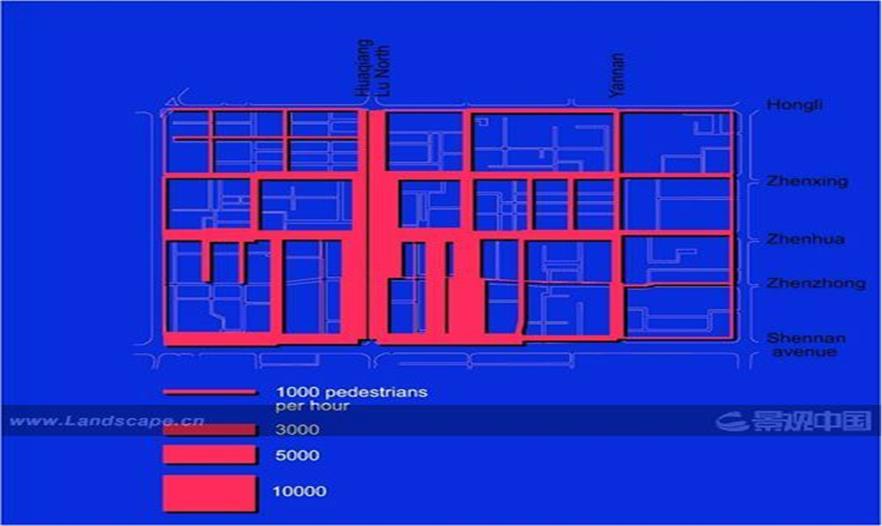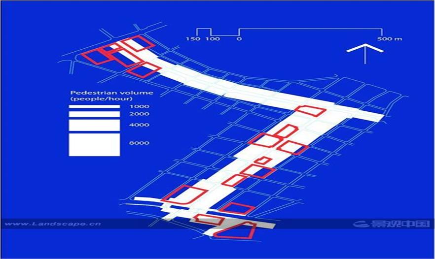 第二個案例是天津和平路中心步行街。這個步行街由天津市長李盛霖在2001年提議建設。2001年時,步行活動及零售業(yè)在濱江道一帶展開,后來和平路步行街得到了發(fā)展。購物中心位于濱江道商業(yè)軸心,為了支持中央步行街,和平路的所有街道均受到嚴格管控。在和平路的西端建立了一個購物中心集群,其他新購物大道散布于整個步行系統(tǒng)中。整個項目以市場為導向,開發(fā)全部由百盛、沃爾瑪?shù)人綘I公司發(fā)起。項目的影響在于加強并整合了和平路與購物中心之間的空隙空間利用。集中形成了和平區(qū)商業(yè)購物中心,并長期促進了周邊街區(qū)住宅與辦公發(fā)展(圖3)。