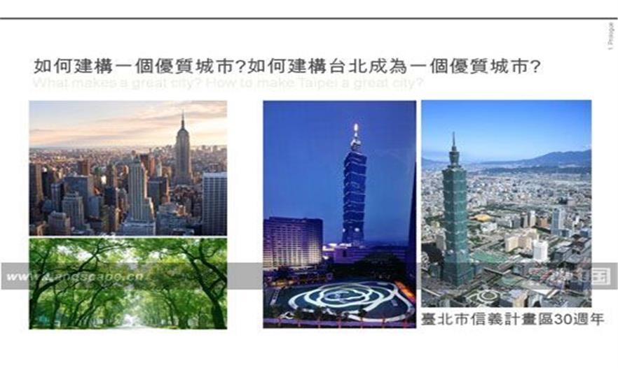 下面這個(gè)案例是我對(duì)臺(tái)北的一個(gè)憧憬——“城市漫游記:探索•樂(lè)活的臺(tái)北城市”。臺(tái)北市已經(jīng)發(fā)展的相當(dāng)完善,現(xiàn)在有一個(gè)城市中心改造工程,這是我們?cè)O(shè)計(jì)的一個(gè)建筑物的屋頂景觀設(shè)計(jì),在屋頂上可以把101大樓、圓山飯店、摩天輪、彩虹橋等多處地表建筑盡收眼底,可是此項(xiàng)目因?yàn)檎叻钤驔](méi)有實(shí)施。很多人認(rèn)為房子蓋在公園旁邊很好,可是我把我的工作室基地建在榮星花園對(duì)面,這是一個(gè)很棒的設(shè)計(jì)與,同時(shí),因?yàn)樗缮綑C(jī)場(chǎng)的緣故,這里的房子都比較低矮;基隆河畔9-10米高的廊亭與蜿蜒起伏的人行步道設(shè)計(jì)都增加了此處景觀的休閑、娛樂(lè)功能。近期,我還在參與臺(tái)灣各高鐵站的廣場(chǎng)景觀設(shè)計(jì)。事實(shí)上,所有都市空間設(shè)計(jì)都需要?jiǎng)側(cè)岵?jì),項(xiàng)目的順利進(jìn)行依賴于開(kāi)發(fā)商的配合和好的政策引導(dǎo)。我的演講到此結(jié)束。謝謝!