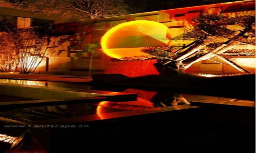 在19棟別墅處,景觀設(shè)計(jì)中巧妙地運(yùn)用原有擋墻做了”山水長(zhǎng)卷”。一輪滿月配以造型羅漢松,自成一幅“明月松間照”的畫意幽境。然而在表現(xiàn)方式上,卻是運(yùn)用現(xiàn)代材料,嵌入發(fā)光燈帶,以立體方式呈現(xiàn)出現(xiàn)代園林。