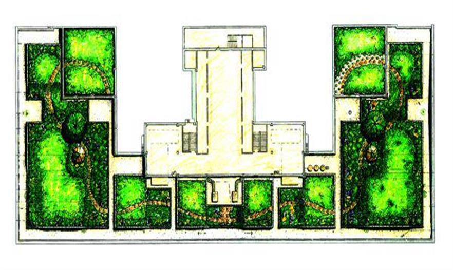 花園的設(shè)計(jì)是由保護(hù)設(shè)計(jì)論壇發(fā)展的,通過建造一個(gè)對(duì)稱的公園和把公園劃分成規(guī)則的形狀來對(duì)應(yīng)建筑的歷史特性。屋頂花園本來不會(huì)對(duì)外開放,但這個(gè)設(shè)計(jì)集中在提供一個(gè)功能性的綠色空間上,設(shè)計(jì)簡(jiǎn)單地環(huán)形通道,用于花園的維護(hù)。