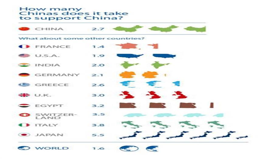 根據(jù)這些表格,美國的生物容量已經(jīng)下降了,而上下浮動的生態(tài)足跡也穩(wěn)定下來了。但是這意味著可用的生物容量和美國生態(tài)足跡之間的赤字還在增長。中國的生態(tài)足跡是穩(wěn)定的,但在2000年左右,其生態(tài)足跡開始猛增,兩者之間差距逐步擴(kuò)大?,F(xiàn)在日本每年需要5.5個日本來支持真實(shí)日本的發(fā)展:它的生物容量持續(xù)縮小,但生態(tài)足跡激增。有趣的是,蘇聯(lián)解體后,俄國的生物容量才真正的急劇增長起來——油氣出口帶來的極少數(shù)的一個積極的環(huán)境效益——而其生態(tài)足跡縮小了但現(xiàn)在又上升了。