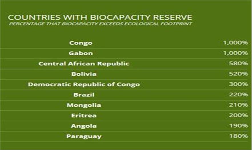 作為該互動性地圖的一部分,該組織列出了成為生物容量保護(hù)區(qū)的所有國家,意味著他們生產(chǎn)和消費(fèi)遠(yuǎn)低于自然能力的負(fù)重水平。這些國家大部分是非洲、南非和中東的發(fā)展中國家,以及像巴西這樣有大額環(huán)保獎金的發(fā)展中國家。