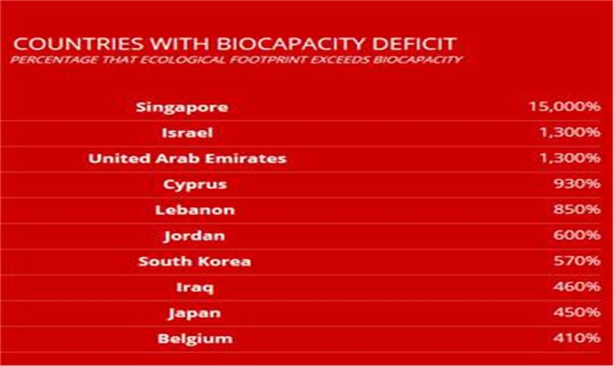 有生物容量赤字的國家意味著他們的消費(fèi)和生產(chǎn)已經(jīng)超過自然環(huán)境所能承受的能力。這些國家都是富裕的、城市化國家,如新加坡、日本和以色列。