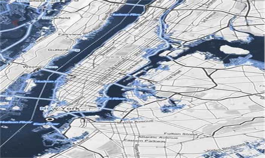 點擊紐約市就會出現(xiàn)洪水產(chǎn)生的相應影響圖,從0.3米—3米(1—10英尺)不等。當有人移動海平面上升的尺度時,曼哈頓下城區(qū)的部分就會淹沒,皇后區(qū)的拉瓜迪亞國際機場都在水下。東河的上升將會淹沒布魯克林城市人口密集的地區(qū),而且新澤西也會成為一個小島。