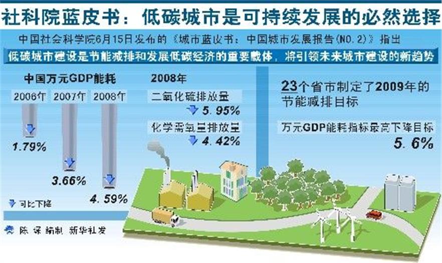 中國社會科學(xué)院2009年6月15日在京發(fā)布了《城市藍(lán)皮書:中國城市發(fā)展報(bào)告(No.2)》。藍(lán)皮書認(rèn)為,低碳城市是可持續(xù)發(fā)展的必然選擇。