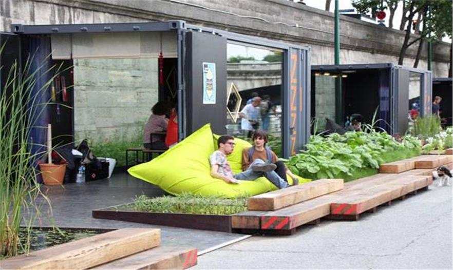塞納河岸 各色的木制建筑元素和座位用于景觀中。在Faust Terrace還能看到藤條裝置。人們坐在木制甲板上或進入到布帳篷中。該項目區(qū)域沿線的建筑單元是使用集裝箱建造的。由于使用了回收材料,這個項目是可持續(xù)發(fā)展的。