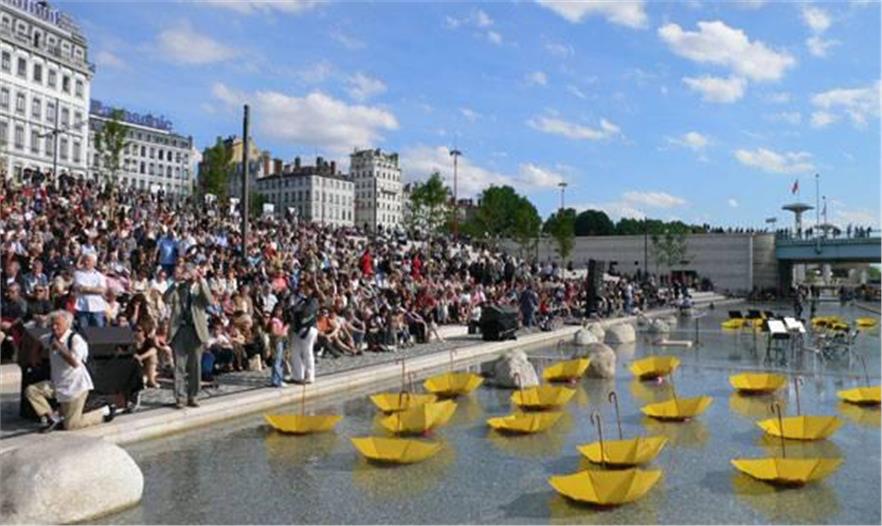 羅納河岸 5千米長的流動項目以及9座橋的景色營造出自然對稱的感覺。這個海濱分為兩層。高的一層用于跑步,低的一層用于行人,營造出運動美學。運動也會營造出美感,因為它體現(xiàn)出該項目正在運作,充滿生機。音樂會上五彩的雨傘和帳篷也是人工建造的,為里昂河岸帶來生機。
