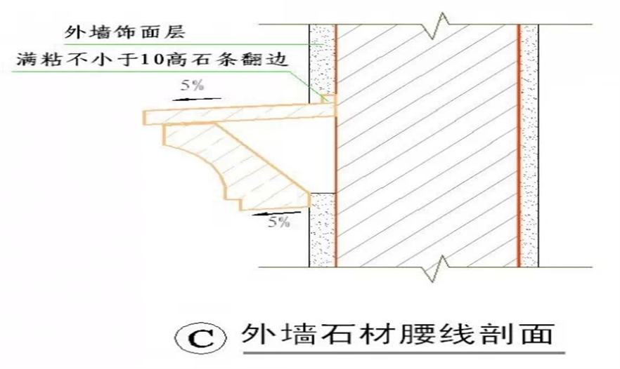 1.所有腰線必須保證上平面有坡度,下有滴水功能;