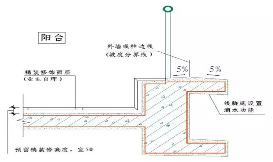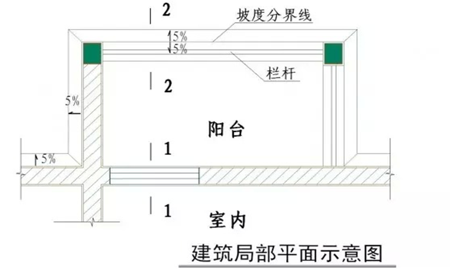 1.陽(yáng)臺(tái)上翻梁與外線條分別設(shè)內(nèi)外排水坡;