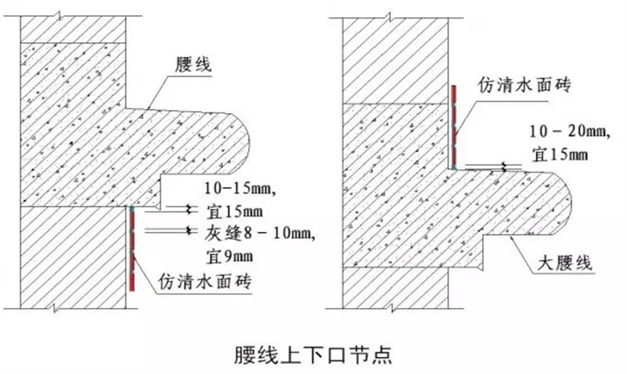 2.外墻線腳下窗頂上豎磚長(zhǎng)度控制在130-170mm之間調(diào)整;