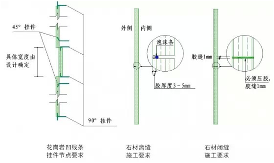 3.石材墻面設(shè)計(jì)要求打明膠時(shí),板縫開三角槽縫或開小凹槽施工。