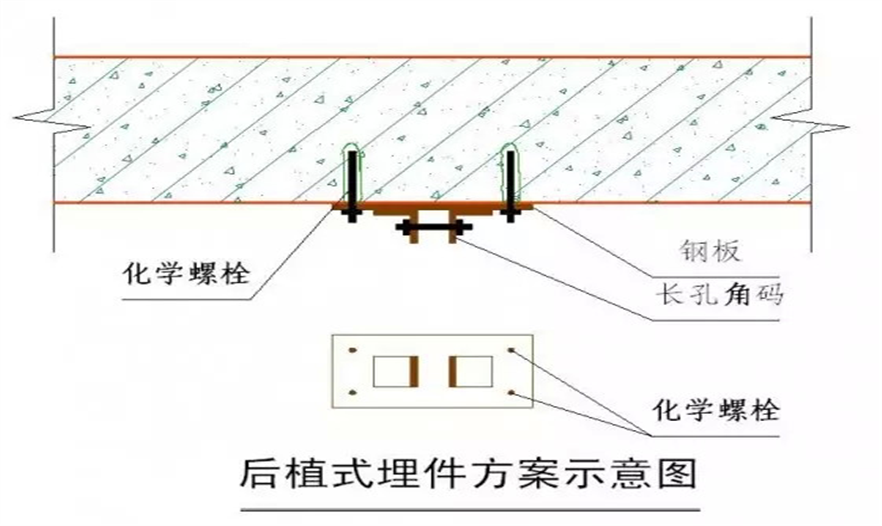 后植式埋件方案,要求鋼板和角碼先在工廠焊接加工,整體熱鍍鋅完成后,進(jìn)行現(xiàn)場(chǎng)安裝。