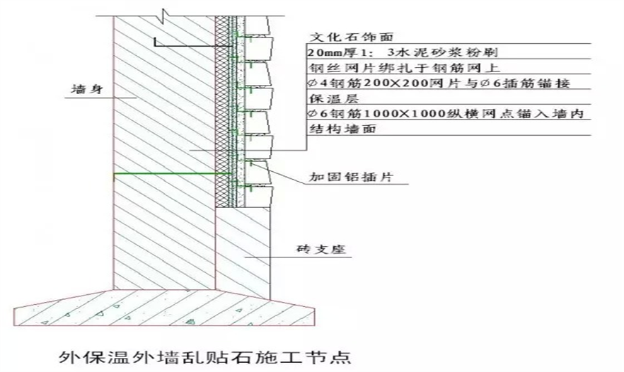 3.文化石飾面高度超過一層時(shí),在二層圈梁部位增設(shè)一道鋼筋砼支座線,如有飾面要求,可選用暗設(shè)方案施工。