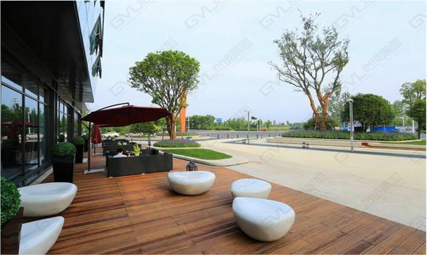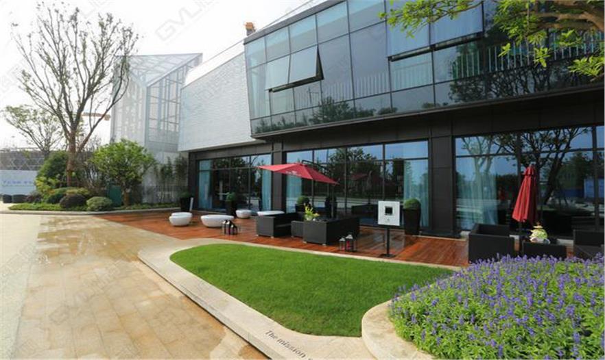 售樓部外部實景圖——由近及遠(yuǎn)鋪裝材質(zhì)依次為木、石材、透水混凝土,層次分明,舒適的洽談空間加入室外軟裝布品后,形成精心、雅致的室外空間