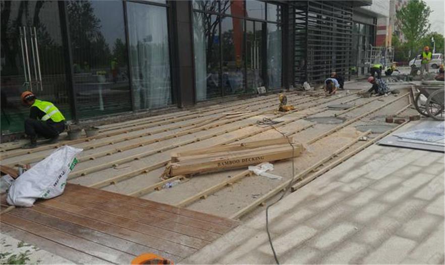 售樓部外部洽談空間完工實景照片——從左至右鋪裝依次為米色透水混凝土、石材、木地板。層次分明,透水混凝土與鋪裝相接平順,實景景觀效果完美呈現(xiàn)