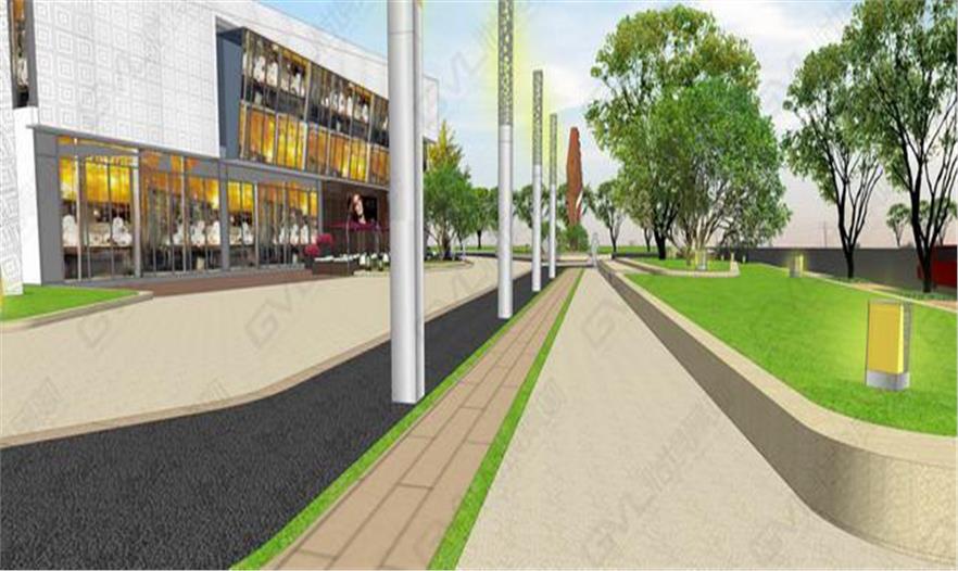 場地主入口效果圖,采用米色及深灰色透水混凝土鋪裝