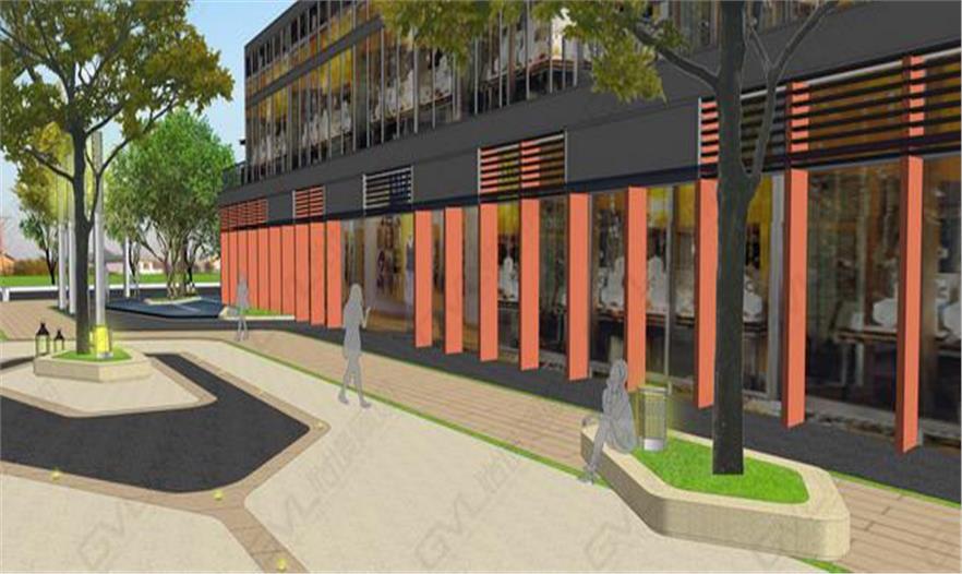 售樓部內(nèi)側(cè)以透水混凝土為主的內(nèi)街街景效果圖——深灰色透水混凝土+米黃色透水混凝土+黃色石材鋪裝與建筑外立面色彩形成豐富的色彩界面