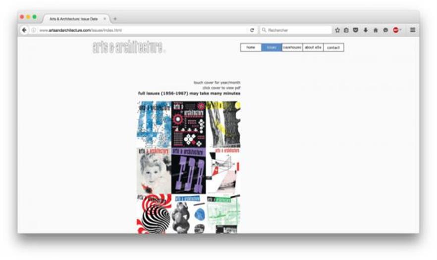 因其 Case Study House 項(xiàng)目聞名, Arts & Architecture 雜志關(guān)注戰(zhàn)后時(shí)期獨(dú)戶住宅的發(fā)展,并格外關(guān)注加利福尼亞南部的建筑師如Richard Neutra, Rudolf Schindler, Charles Eames, Frank Lloyd Wright, 和 John Lautner 。在1929年至1967年間出版,這個(gè)網(wǎng)站現(xiàn)在致力于編輯整理 Arts & Architecture ,提供1945年起的特選文章的數(shù)字版,以及這本雜志最后11年的全部內(nèi)容。