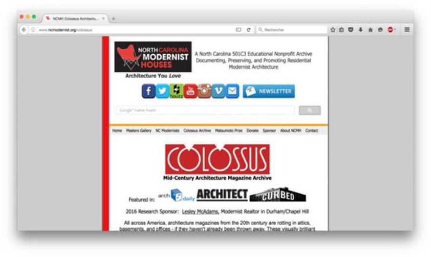 由北卡羅來納現(xiàn)代主義之家(NCMH) 和 Hanley Wood ( ARCHITECT的總公司),創(chuàng)建,Colossus 以20世紀(jì)建筑出版物為主,并尤其關(guān)注60,70,80年代的設(shè)計(jì)。到了完成的時(shí)候,這座數(shù)字檔案館將提供超過1,300,000頁內(nèi)容,成為最大的在線現(xiàn)代主義建筑資料庫。