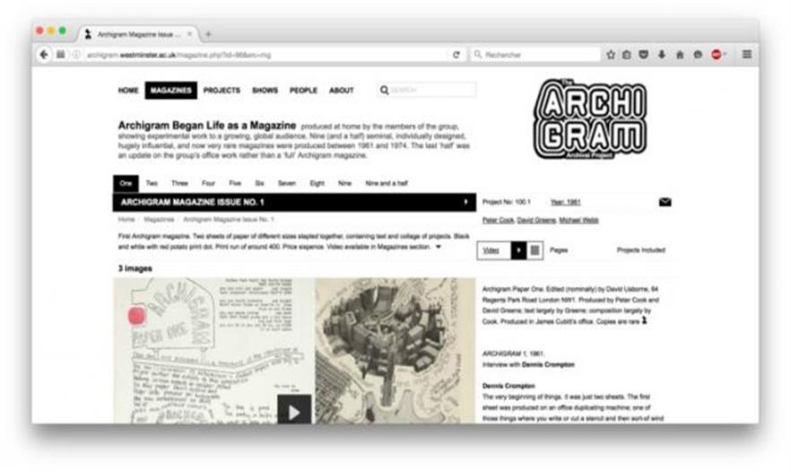 影響廣泛的 Archigram 團(tuán)隊(duì)在1961年至1974年間活躍,他們的作品現(xiàn)在已經(jīng)被數(shù)字化。威斯敏斯特大學(xué)的學(xué)生和剩下的阿基格拉姆(Archigram)成員以及他們的傳人合作創(chuàng)建了這個(gè)平臺(tái)。這座數(shù)據(jù)庫包括圖畫,拼貼畫,畫作,攝影,雜志,文章,幻燈片和多媒體材料,以及阿基格拉姆最初的文本。考慮到大部分阿基格拉姆的作品都未建成,其數(shù)字化提供了一座詩化的建筑,來保存參與其中的建筑師的成績。