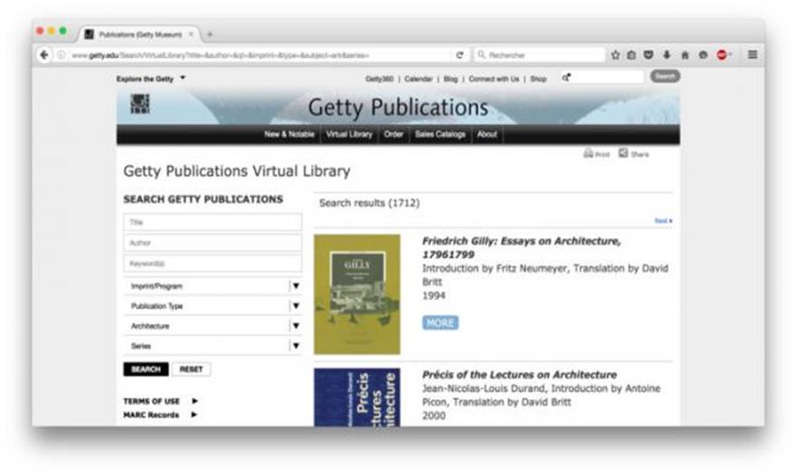 2014年, Getty Publication 成立了它的虛擬圖書館,包括超過250個(gè)主題用于在線免費(fèi)閱讀。由 Getty Publication 出版的作品包括 J. Paul Getty Museum, the Getty Conservation Institute 和 Getty Research Institute 的作品。圖書館的資源涵蓋了建筑學(xué),以及美術(shù),攝影,考古,文物保護(hù)以及人文等等方面。你也可以在 Getty’s education portal找到有趣的材料。