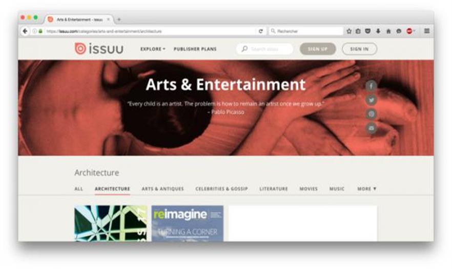 擁有超過21,000,000部出版物,ISSUU 是一個(gè)極具吸引力的雜志,目錄和報(bào)紙的出版平臺(tái),并且已經(jīng)成為被想要讓作品在線上免費(fèi)的小出版商和個(gè)人廣泛使用平臺(tái)。這家數(shù)字媒體公司既提供關(guān)于文化,藝術(shù),生活和(最主要的)建筑學(xué)的主流內(nèi)容,也包含新興話題。