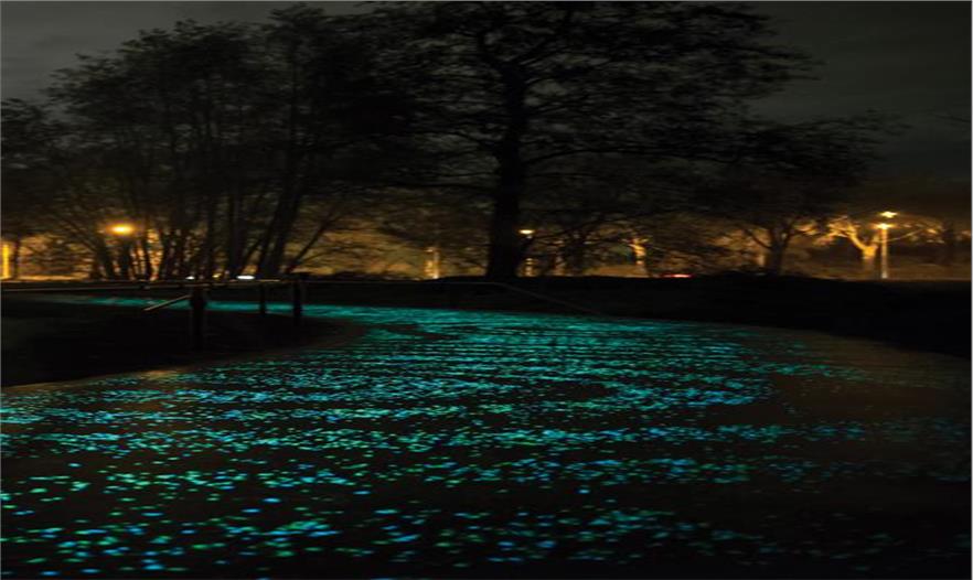 在涂料和涂層,我們了解了下一代表面發(fā)展的潛力,能夠產(chǎn)生捕獲陽光、電力生產(chǎn)和結(jié)構(gòu)檢測的涂層技術(shù)。一個案例是熒光噴繪,在荷蘭智能高速公路項目上發(fā)現(xiàn)的。Roosegaarde and Heijmans事務(wù)所的團隊建造了一個實驗臺,帶有熒光條,吸收日光,在晚上長達8個小時的時間里發(fā)光??紤]一下燈光節(jié)約成本和創(chuàng)意機會。