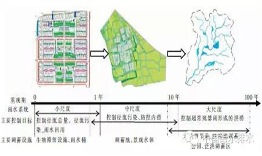 小尺度(即在通常進(jìn)入市政管線前的獨(dú)立用地單元內(nèi))分散式調(diào)蓄,以控制徑流排放總量和污染、雨水利用等功能為主,常用雨水池/桶、生物滯留設(shè)施等灰色及綠色源頭調(diào)蓄設(shè)施,針對(duì)中小降雨事件來(lái)設(shè)計(jì)設(shè)施規(guī)模。中尺度(如進(jìn)入市政的一個(gè)排水區(qū)域)往往更側(cè)重于控制徑流污染、防控內(nèi)澇,常用調(diào)節(jié)池、儲(chǔ)蓄池、雨水濕地和景觀水體等設(shè)施。大尺度(例如城市、流域范圍)除了要涵蓋前兩個(gè)尺度的調(diào)蓄和控制目標(biāo)外,還需要考慮從更大范圍和利用終端設(shè)施來(lái)控制超常規(guī)暴雨,往往還需要考慮采用大型調(diào)節(jié)池、調(diào)蓄隧道、多功能調(diào)蓄公園或開(kāi)放空間、泛洪調(diào)蓄區(qū)等大型設(shè)施才能實(shí)現(xiàn)其控制效果,而且,在這三個(gè)尺度之間,也具有十分復(fù)雜的耦合和交叉關(guān)系,并不是截然分開(kāi)。