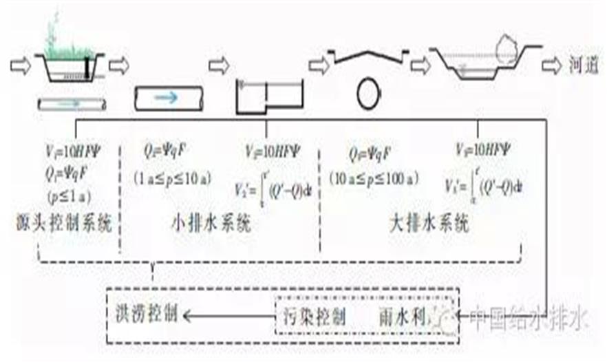 此外,還可從城市雨洪控制利用各子系統(tǒng)中的控制目標(biāo)來(lái)分析調(diào)蓄系統(tǒng)的構(gòu)成,即,由具有徑流總量和污染控制、雨水利用、排水防澇峰值控制等不同功能的各種調(diào)蓄設(shè)施所組成,也是源頭LID控制系統(tǒng)、小排水系統(tǒng)、大排水系統(tǒng)的重要組成部分。通過(guò)調(diào)蓄系統(tǒng)和管渠排放系統(tǒng)的有機(jī)組合,為構(gòu)建城市良性水文循環(huán)和“海綿”城市發(fā)揮關(guān)鍵作用。