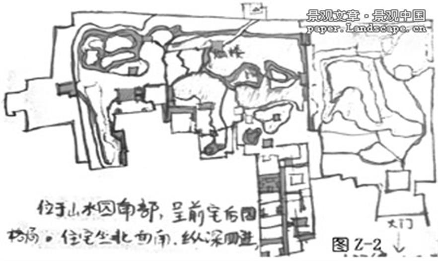 蘇州園林主要為宅園,傳統(tǒng)文化十分注重宅園“風(fēng)水”。蘇州園林在選址和布局上自然要找“風(fēng)水佳穴”。例如拙政園:背面靠山,右東環(huán)路,前有主人為彌補(bǔ)自然環(huán)境的不足在前面做了一個(gè)大水面。水面的形狀是經(jīng)過(guò)設(shè)計(jì)的,沿岸曲折,配有假山疊石,把自然之景與人造之景結(jié)合起來(lái)。趣由此生。 如圖3。