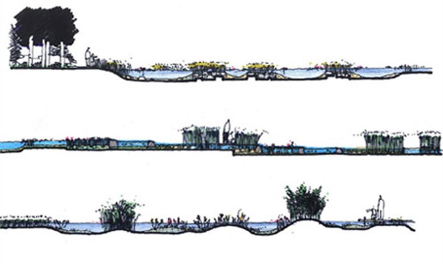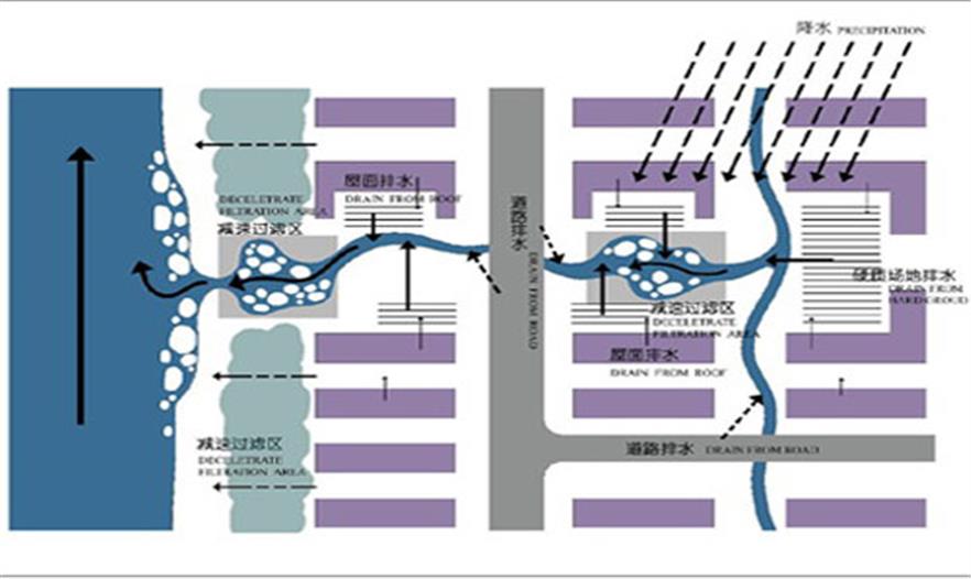 從功能和尺度上,這個(gè)水系統(tǒng)分為三個(gè)層面:外圍防洪系統(tǒng)、城區(qū)蓄澇系統(tǒng)、場(chǎng)地雨洪利用生態(tài)設(shè)計(jì)。