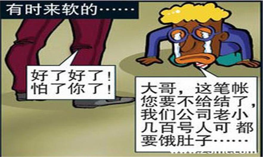 催款是一件極耗體力與腦力的事情,到了這個(gè)階段,就別嫌一哭二鬧三上吊丟臉了,什么法子有用就用什么法子,比如下面三種方法: