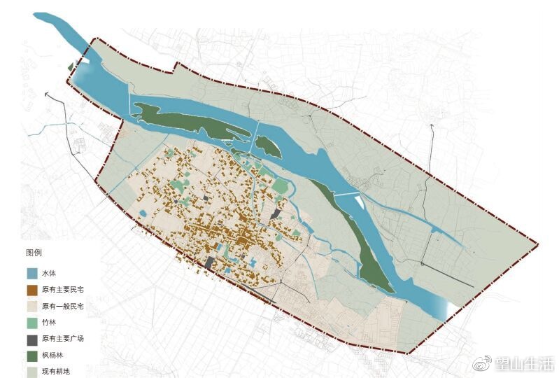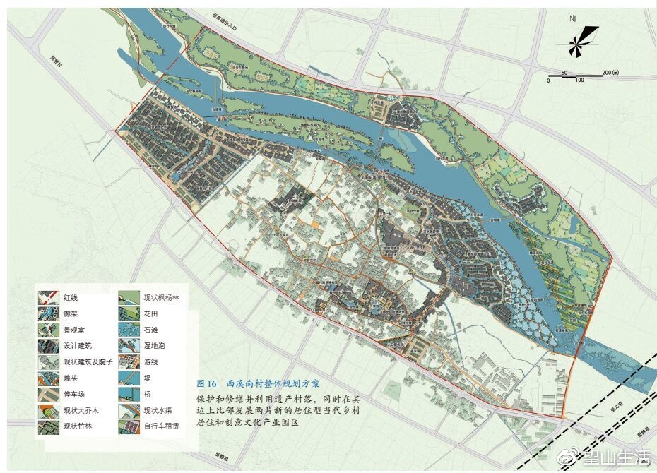 圖 16 西溪南村整體規(guī)劃方案 保護(hù)和修繕并利用遺產(chǎn)村落,同時(shí)在其邊上比鄰發(fā)展兩片新的居住型當(dāng)代鄉(xiāng)村居住和創(chuàng)意文化產(chǎn)業(yè)園區(qū)