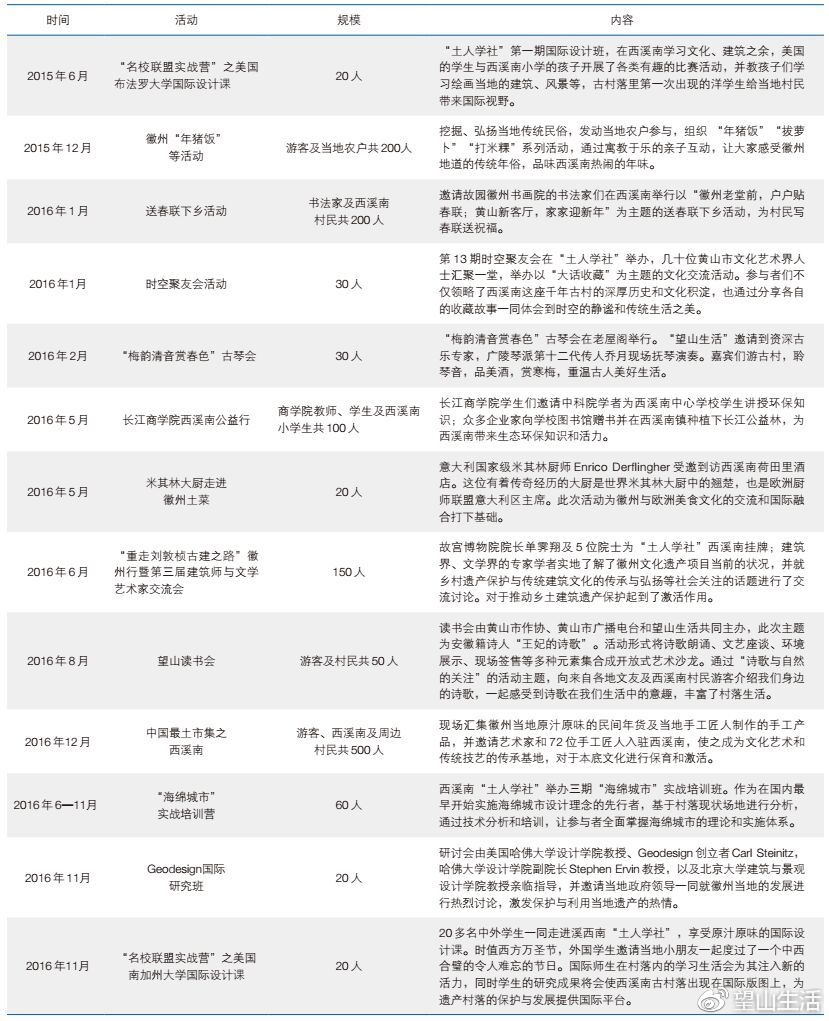利用閑置的糧庫(kù)和小學(xué),首先開辦了“土人學(xué)社”(Turenscape Academy),開展國(guó)際化的鄉(xiāng)村設(shè)計(jì)人才培訓(xùn),引入新的創(chuàng)意產(chǎn)業(yè)文化。近1年來,已經(jīng)吸引了來自美國(guó)哈佛大學(xué)、南加州大學(xué)、布法羅大學(xué)等多批建筑與景觀設(shè)計(jì)專業(yè)的學(xué)生在此游學(xué)和進(jìn)行設(shè)計(jì)課程。當(dāng)?shù)貎和脖晃齾⑴c其中;同時(shí),政府官員被邀請(qǐng)參加規(guī)劃設(shè)計(jì)課程的研討,激發(fā)保護(hù)與利用當(dāng)?shù)剡z產(chǎn)的熱情;學(xué)社還組織了故宮博物院院長(zhǎng)及建筑界的5位院士在內(nèi)的名家學(xué)者在此開展學(xué)術(shù)報(bào)告和論壇,開展了旨在推動(dòng)鄉(xiāng)土建筑遺產(chǎn)保護(hù)的“重走劉敦楨古建之路”等一系列的文化藝術(shù)活動(dòng),激活了沉睡和凋敝的遺產(chǎn)村落(表 1,圖 10和11)。