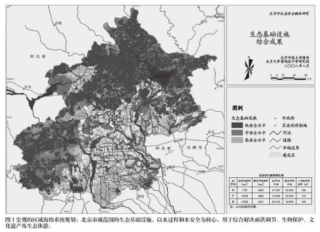 宏觀尺度的國(guó)土和區(qū)域海綿系統(tǒng)。在這一尺度上,“海綿國(guó)土”的構(gòu)建重點(diǎn)是研究水系統(tǒng)在國(guó)土尺度和流域中的空間格局,即進(jìn)行水生態(tài)安全格局分析,并將水生態(tài)安全格局落實(shí)在NOV 2016 FRONTIERS 13國(guó)土空間規(guī)劃和土地利用總體規(guī)劃、城市及區(qū)域的總體規(guī)劃中,通過(guò)生態(tài)紅線(xiàn)的劃定,成為國(guó)土和區(qū)域的生態(tài)基礎(chǔ)設(shè)施,也是國(guó)土“反規(guī)劃”的關(guān)鍵(俞孔堅(jiān)、李迪華等,2005)。2013年十八屆三中全會(huì)公告《中共中央關(guān)于全面深化改革若干重大問(wèn)題的決定》提出“統(tǒng)一行使所有國(guó)土空間用途管制職責(zé)”,2015年9月通過(guò)的《生態(tài)文明體制改革總體方案》提出“以空間規(guī)劃為基礎(chǔ)、以用途管制為主要手段的國(guó)土空間開(kāi)發(fā)保護(hù)制度”,為宏觀的國(guó)土與區(qū)域海綿系統(tǒng)建設(shè)指明了道路;最近中央發(fā)布的《關(guān)于劃定并嚴(yán)守生態(tài)保護(hù)紅線(xiàn)的若干意見(jiàn)》(2016年11月)以及國(guó)土資源部、環(huán)境保護(hù)部等九部委聯(lián)合印發(fā)的《關(guān)于加強(qiáng)資源環(huán)境生態(tài)紅線(xiàn)管控的指導(dǎo)意見(jiàn)》(2016年6月)將為國(guó)土生態(tài)基礎(chǔ)設(shè)施空間規(guī)劃和國(guó)土海綿系統(tǒng)的構(gòu)建提供潛在的法規(guī)保障,但在技術(shù)上尙有待進(jìn)一步完善。鑒于水作為生態(tài)因子的核心地位,我們必須將水生態(tài)安全格局作為生態(tài)紅線(xiàn)劃定的最重要的依據(jù)(圖1)。