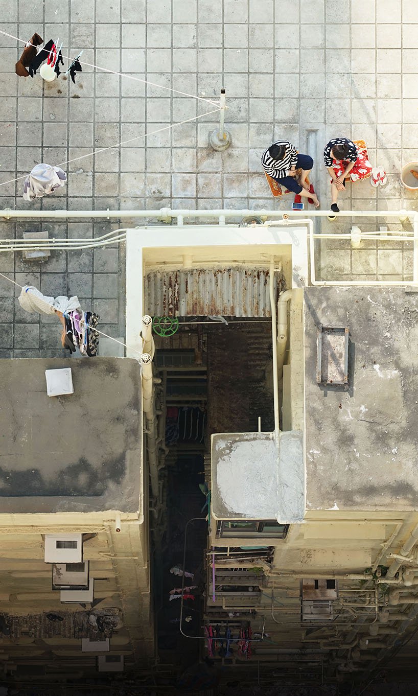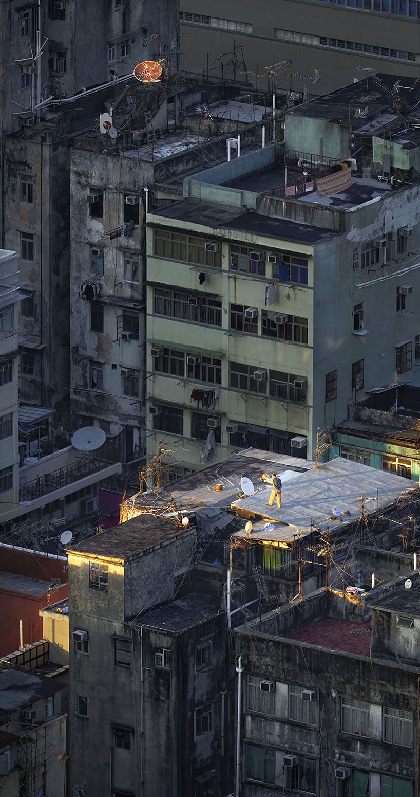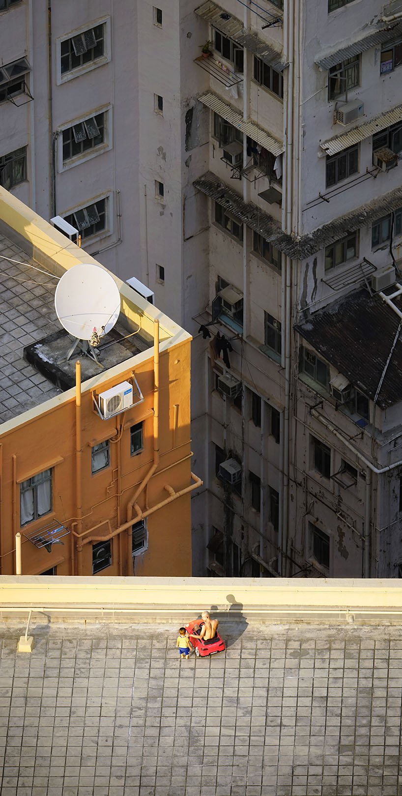 romain jacquet-lagrèze把自己當(dāng)成一位城市觀察員,等待著抓住那些有趣的場(chǎng)景,而不是聚焦于某個(gè)人或某些特定的地點(diǎn)。第一張照片拍攝于2014年,是在執(zhí)行另一個(gè)項(xiàng)目時(shí)偶然拍到的?!爱?dāng)時(shí)附近的一片屋頂突然出現(xiàn)在燦爛的陽(yáng)光下,而且我看到有什么在動(dòng)?!睌z影師說(shuō),“我意識(shí)到是有人在修天線,他就像是陽(yáng)光下的焦點(diǎn)一樣,于是我快速地拍下了這個(gè)場(chǎng)景,那個(gè)瞬間就像有魔力一樣吸引了我?!敝钡綆讉€(gè)星期以后,在偶然看到另一個(gè)天臺(tái)上,有一個(gè)小女孩在拍攝游行隊(duì)伍的情景時(shí),jacquet-lagrèze才決定做一個(gè)影集作品concrete stories,來(lái)記錄香港的天臺(tái)生活。拍攝的屋頂大部分都是公共屋頂,攝影師也把它叫做是“天上的院子”。