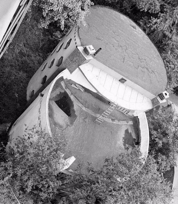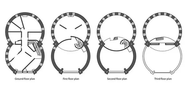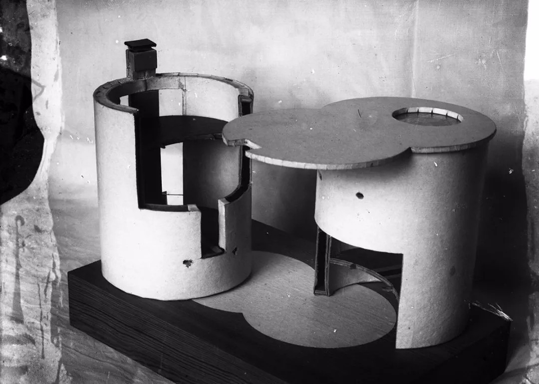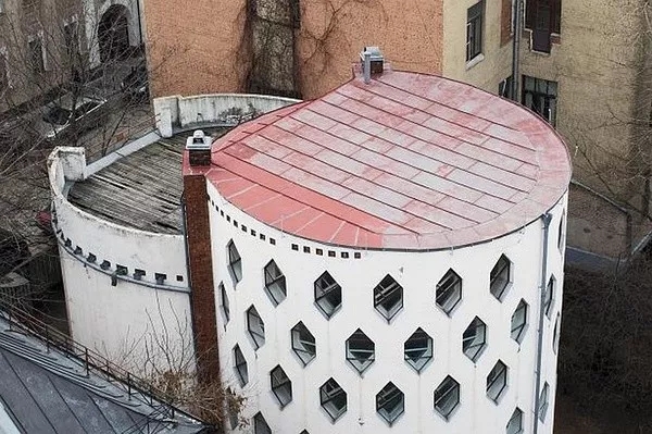 梅爾尼科夫自住宅采用雙圓柱形塔樓結(jié)構(gòu),外觀像是兩個(gè)高低不同的水泥圓柱相互嵌入,遍布整個(gè)外立面的六角型窗孔,能給人留下過(guò)目不忘的印象。房屋內(nèi)部目光所及之處幾乎沒(méi)有直角,盡是圓潤(rùn)柔和的線條,這也讓建筑的有效面積多出許多,實(shí)用型大大提高。