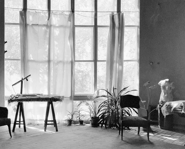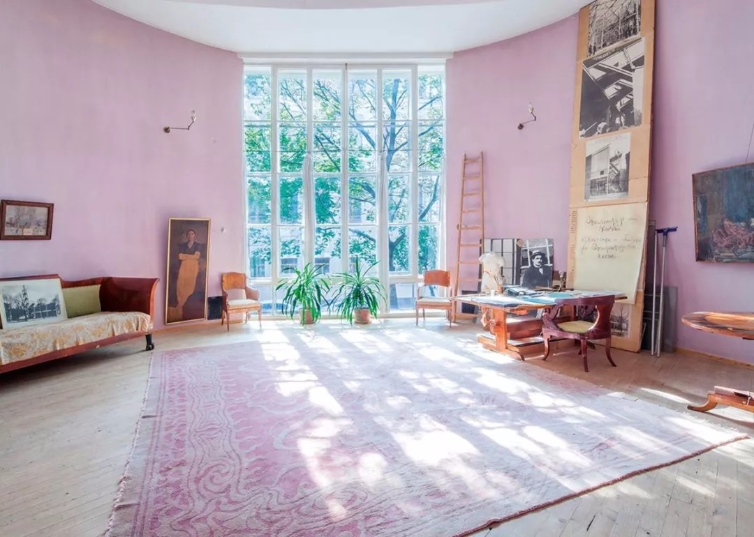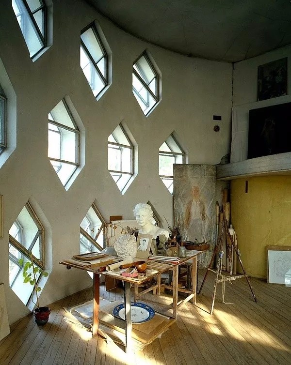 第三層為梅爾尼科夫的工作室。工作室內(nèi)有38扇裝飾著復(fù)雜圖案的六角窗,光線均勻地從各個(gè)方向照射進(jìn)室內(nèi),為建筑師的工作室創(chuàng)造了最理想的照明條件:無(wú)論身處空間的任何角落,手的影子都不會(huì)遮擋住圖紙。